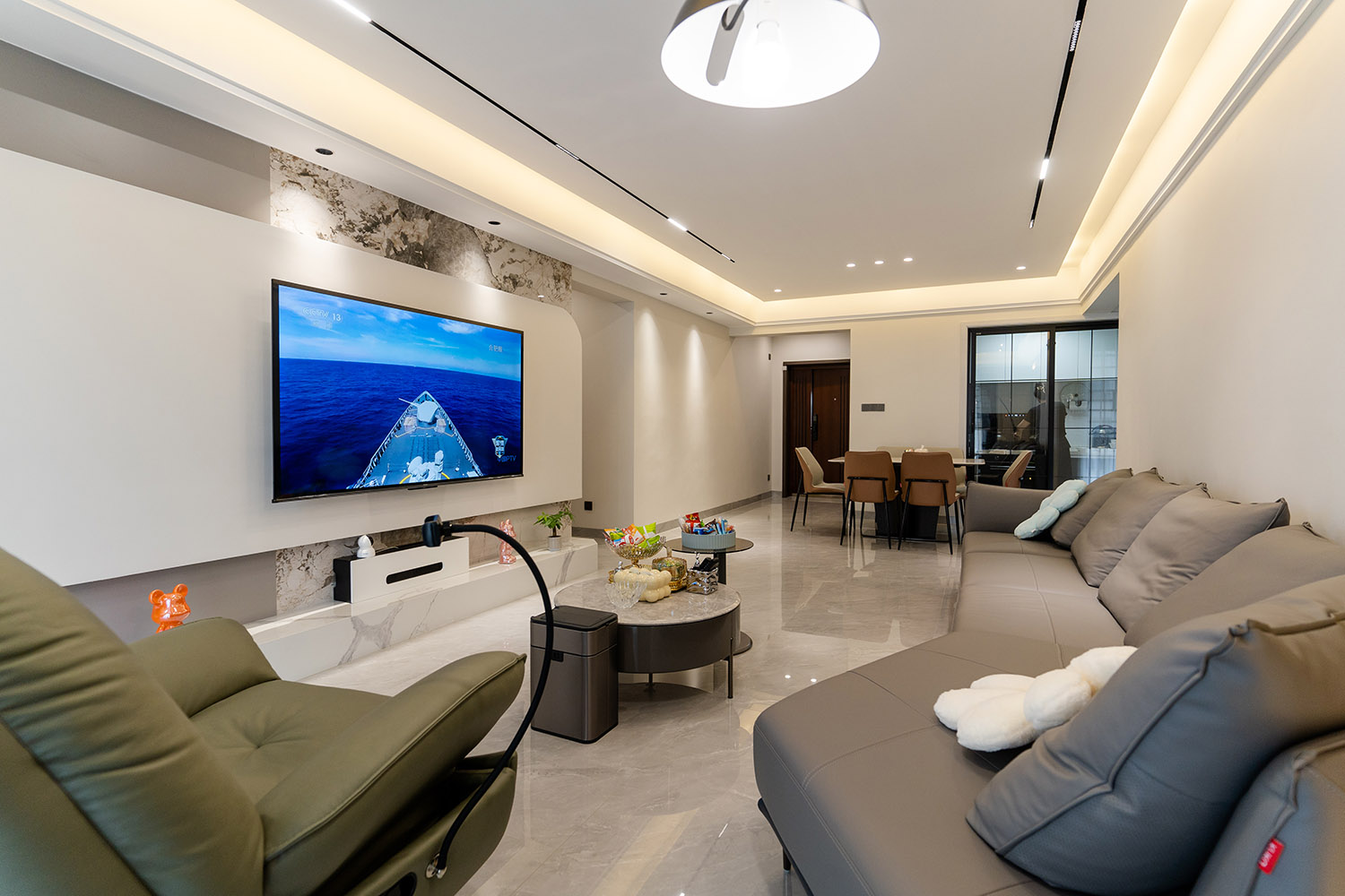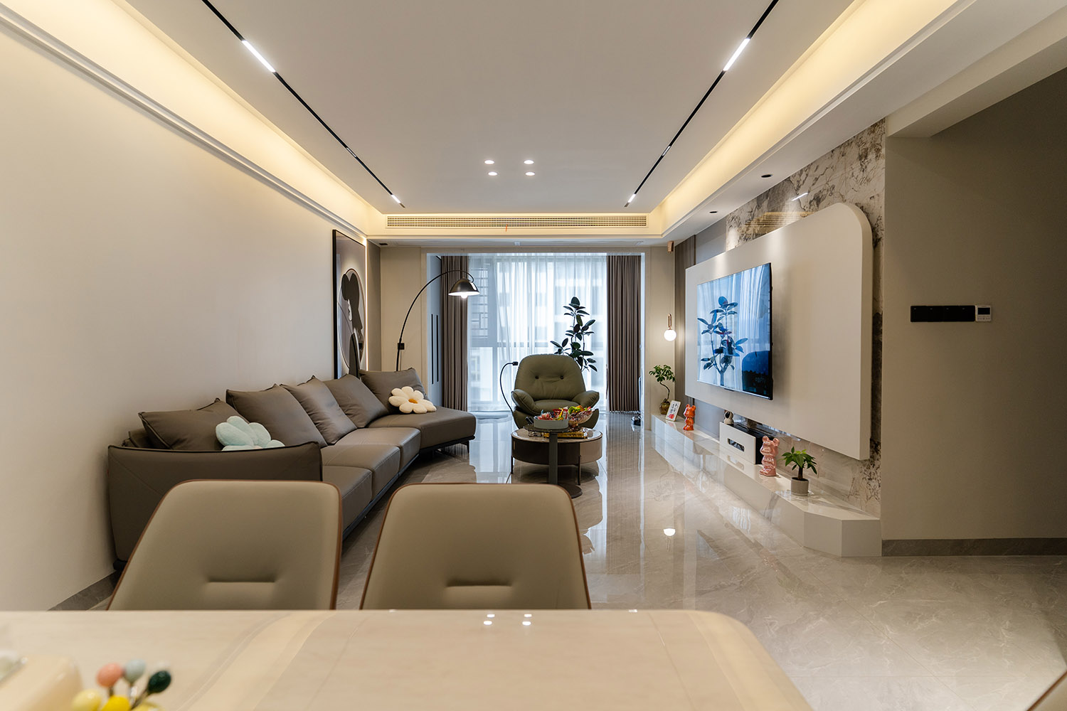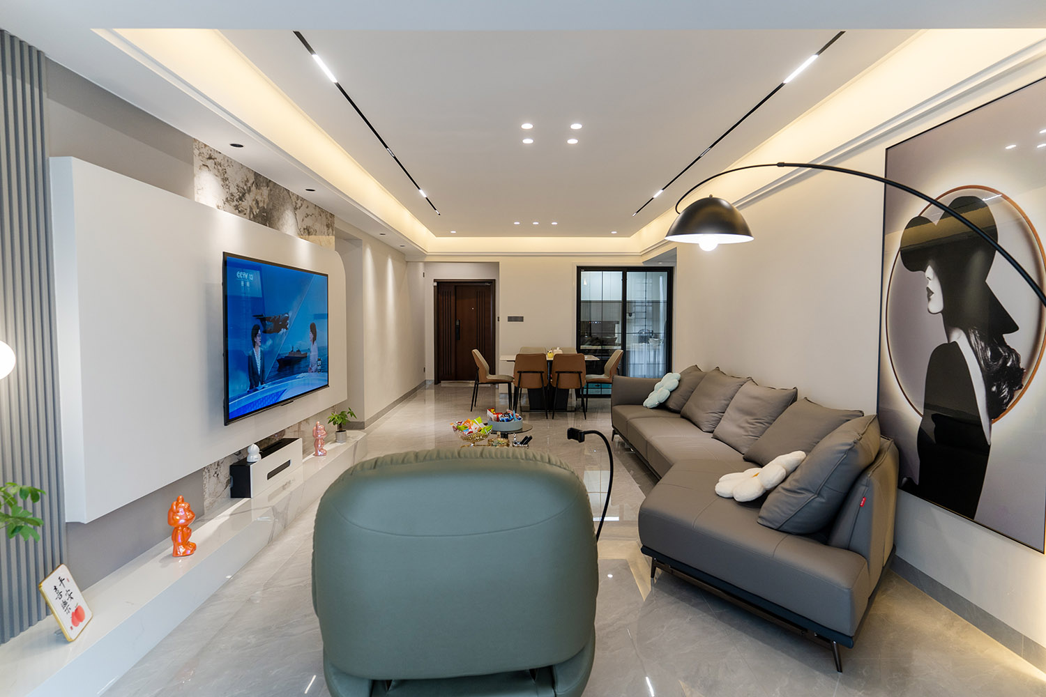 设计理念:简而不减,功能至上 本案的核心设计理念是 “简于形,精于心” 。旨在通过精准的布局、一体化的定制和克制的装饰,实现功能性与美学的完美平衡。设计拒绝为形式而形式,每一处都回归到居住的本质需求,在满足强大收纳和流畅动线的基础上,通过材质、光影和线条的细微变化,营造出一个兼具理性逻辑与感性温度的现代家园。 现代简约风格以其简洁的形态、实用的功能与克制的表达,成为打造理想家的经典选择。它剥离冗余装饰,强调空间本身的结构美与生活其中的舒适度。本案以中海学府里124平方米的三居室为载体,深入解析如何通过现代设计手法,在有限面积内实现功能、美感与开阔感的最大化平衡,打造一个高效、明亮、宜居且充满细节品质的现代居所。