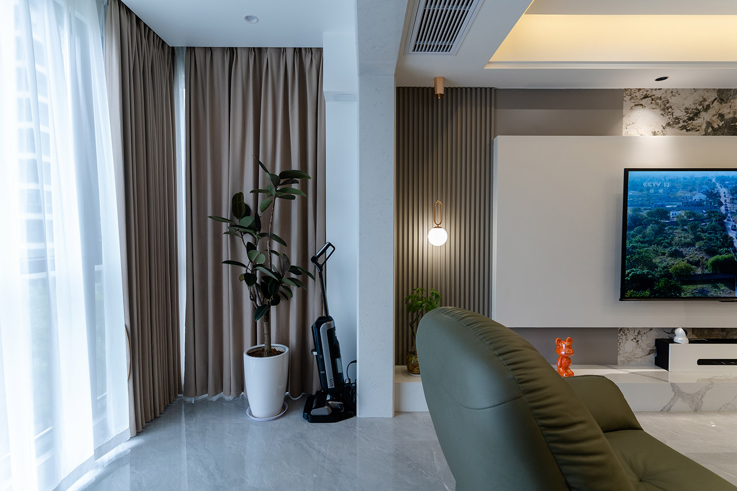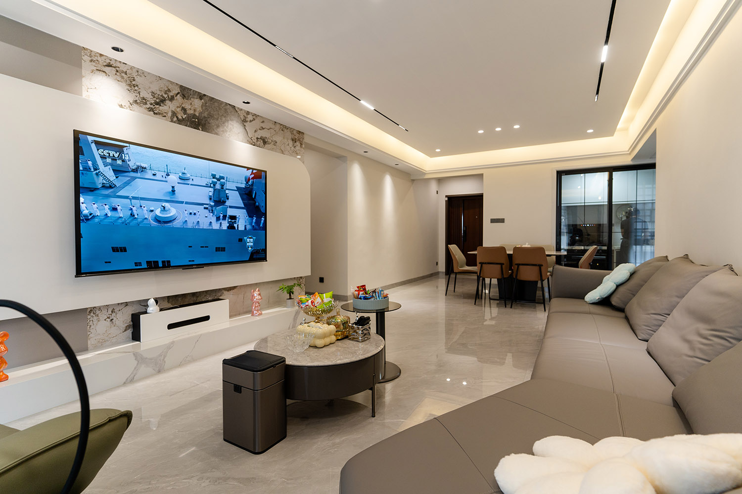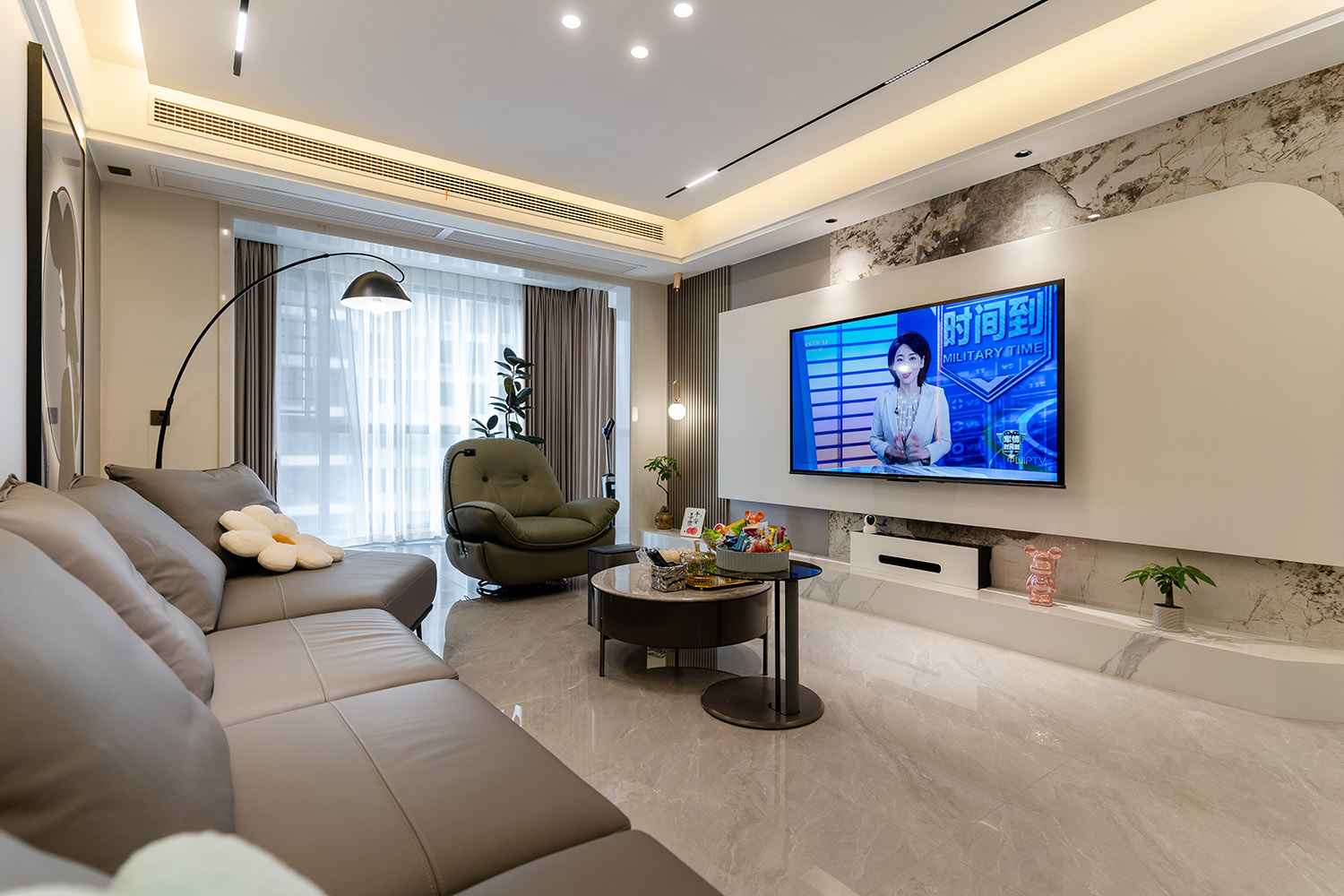 设计理念:简而不减,功能至上 本案的核心设计理念是 “简于形,精于心” 。旨在通过精准的布局、一体化的定制和克制的装饰,实现功能性与美学的完美平衡。设计拒绝为形式而形式,每一处都回归到居住的本质需求,在满足强大收纳和流畅动线的基础上,通过材质、光影和线条的细微变化,营造出一个兼具理性逻辑与感性温度的现代家园。 现代简约风格以其简洁的形态、实用的功能与克制的表达,成为打造理想家的经典选择。它剥离冗余装饰,强调空间本身的结构美与生活其中的舒适度。本案以中海学府里124平方米的三居室为载体,深入解析如何通过现代设计手法,在有限面积内实现功能、美感与开阔感的最大化平衡,打造一个高效、明亮、宜居且充满细节品质的现代居所。