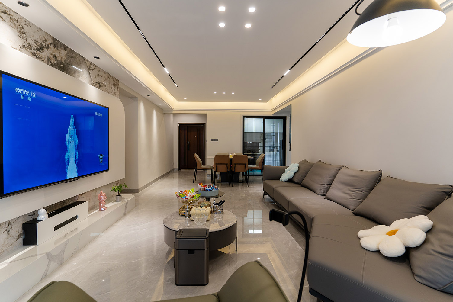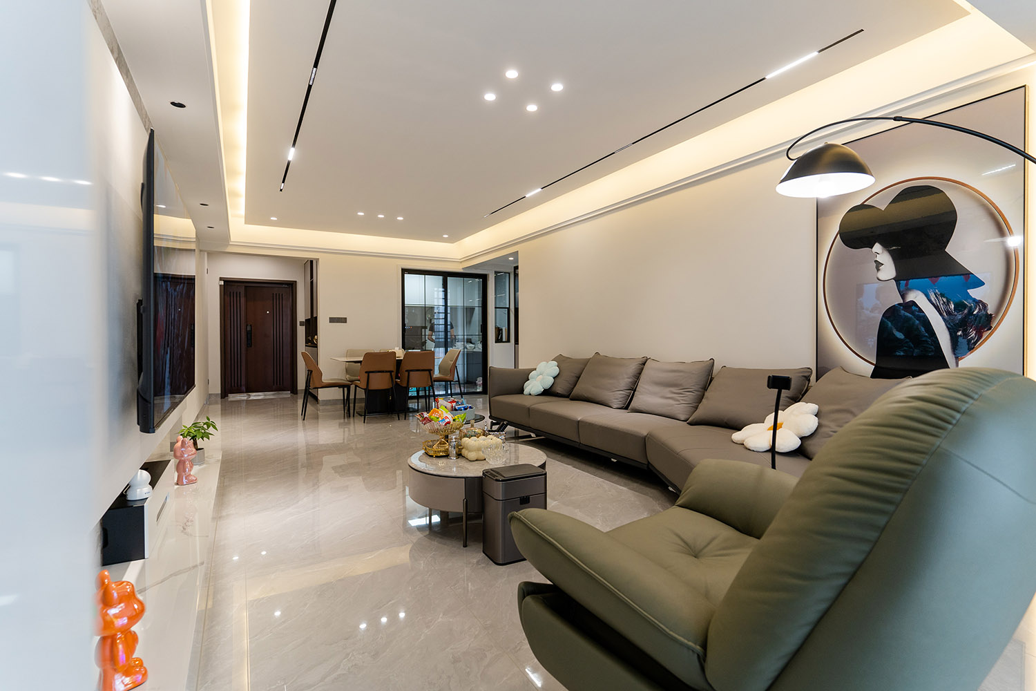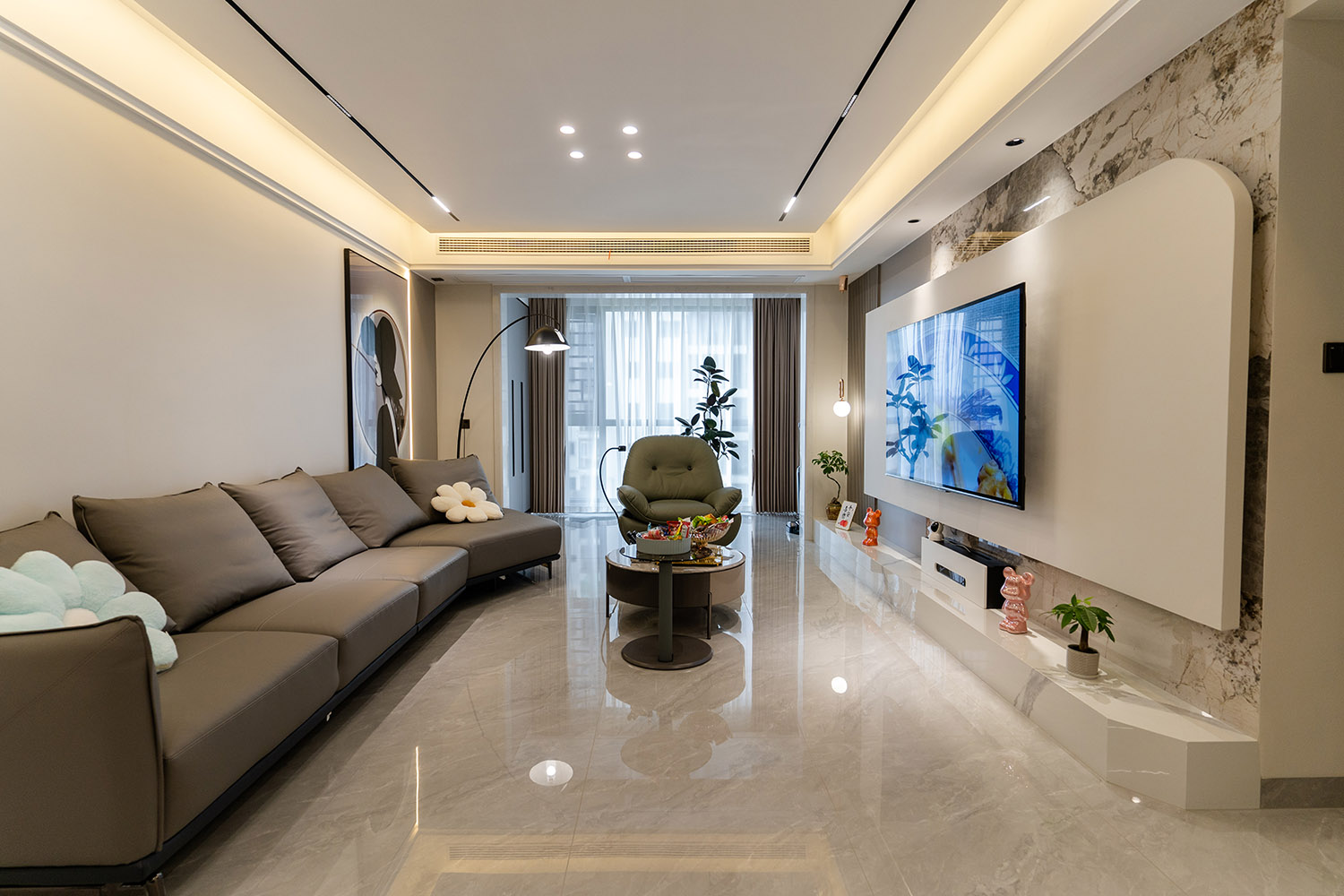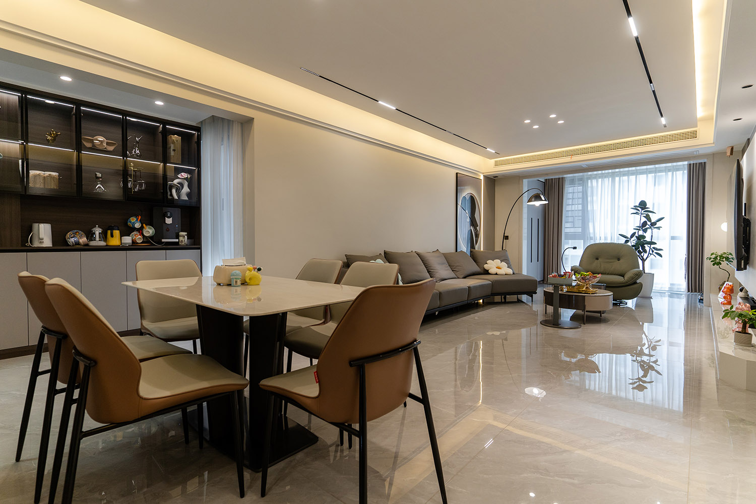 设计理念:简而不减,功能至上 本案的核心设计理念是 “简于形,精于心” 。旨在通过精准的布局、一体化的定制和克制的装饰,实现功能性与美学的完美平衡。设计拒绝为形式而形式,每一处都回归到居住的本质需求,在满足强大收纳和流畅动线的基础上,通过材质、光影和线条的细微变化,营造出一个兼具理性逻辑与感性温度的现代家园。 现代简约风格以其简洁的形态、实用的功能与克制的表达,成为打造理想家的经典选择。它剥离冗余装饰,强调空间本身的结构美与生活其中的舒适度。本案以中海学府里124平方米的三居室为载体,深入解析如何通过现代设计手法,在有限面积内实现功能、美感与开阔感的最大化平衡,打造一个高效、明亮、宜居且充满细节品质的现代居所。