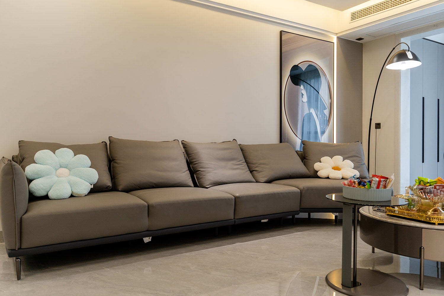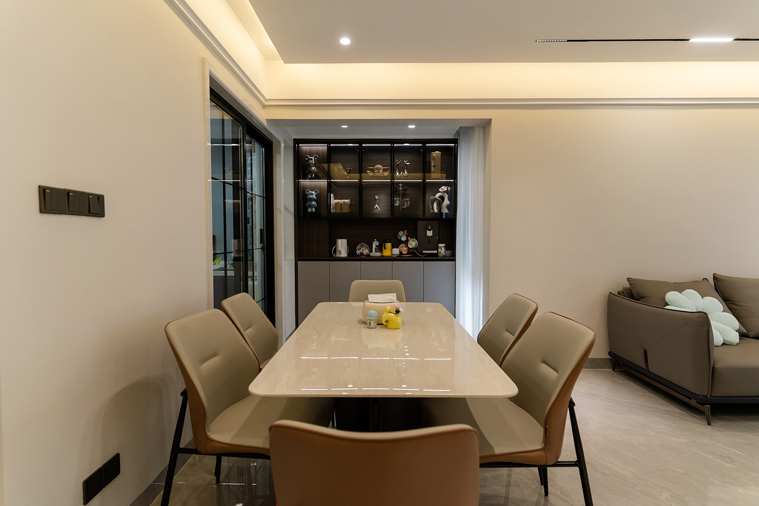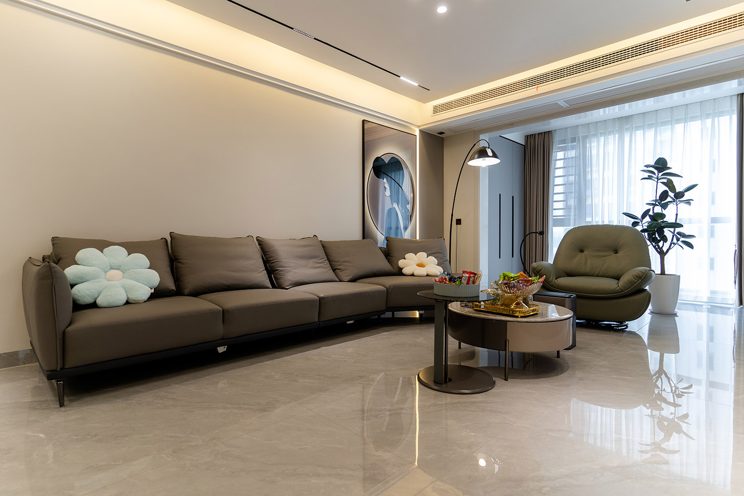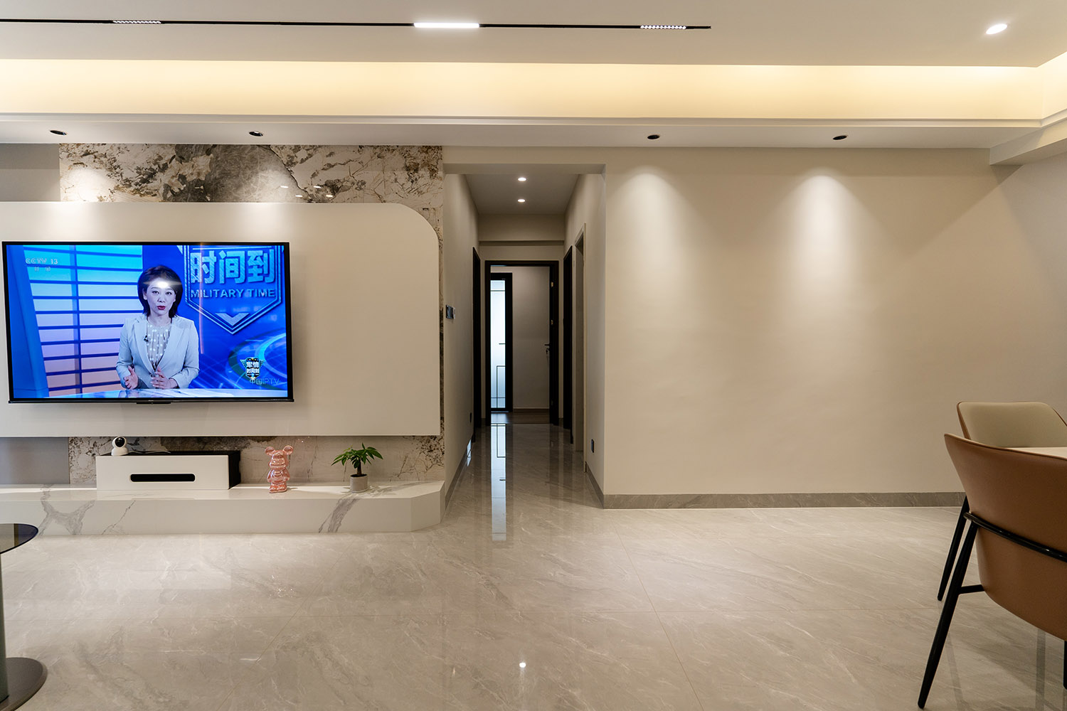 设计理念:简而不减,功能至上 本案的核心设计理念是 “简于形,精于心” 。旨在通过精准的布局、一体化的定制和克制的装饰,实现功能性与美学的完美平衡。设计拒绝为形式而形式,每一处都回归到居住的本质需求,在满足强大收纳和流畅动线的基础上,通过材质、光影和线条的细微变化,营造出一个兼具理性逻辑与感性温度的现代家园。 现代简约风格以其简洁的形态、实用的功能与克制的表达,成为打造理想家的经典选择。它剥离冗余装饰,强调空间本身的结构美与生活其中的舒适度。本案以中海学府里124平方米的三居室为载体,深入解析如何通过现代设计手法,在有限面积内实现功能、美感与开阔感的最大化平衡,打造一个高效、明亮、宜居且充满细节品质的现代居所。